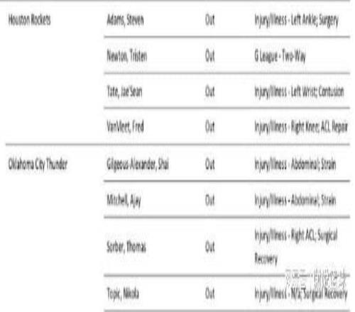 如今處于連敗中的火箭,終于迎來利好消息,那就是前往俄克拉荷馬,客場對陣衛冕冠軍雷霆前,官方報告已經發了出來。我們可以看到雷霆三大主將受傷,除了核心亞歷山大,此外杰倫-威廉姆斯和阿杰-米切爾,同樣確定無法出場。