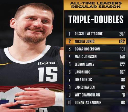 約基奇達成生涯常規賽第182次三雙,正式超越大O奧斯卡-羅伯特森181次三雙獨占歷史第二,僅次于前隊友威少207次三雙。