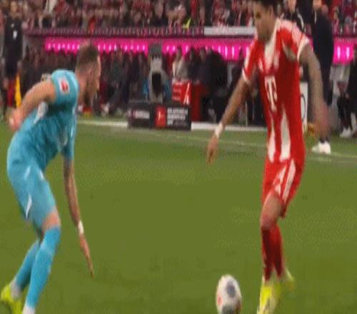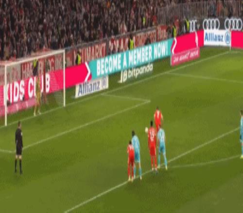 第67分鐘,替補登場的倫納特-卡爾前場攔截,路易斯-迪亞斯右路傳中,凱恩跟上勁射,鮑曼奮力一撲,皮球擊中立柱彈出。