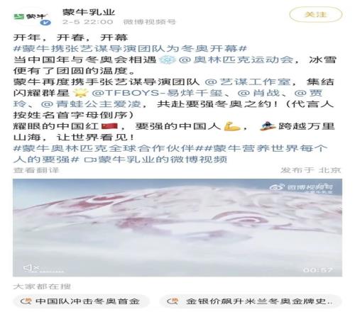 此外在開幕式前,蒙牛正式發布了冬奧會主題片,明星陣容龐大。導演是張藝謀,易烊千璽、肖戰、賈玲、谷愛凌等蒙牛代言人悉數出現在鏡頭里。這是一個標準的品牌大片,冰雪和中國紅色窗花相遇,各位代言人用滑雪、滑冰的姿態出現在鏡頭里,穿插著意大利的城市景觀和冬奧賽事鏡頭。扣題、陣容強大、有視覺美感。