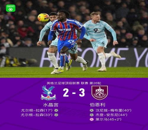 北京時間2月12日英格蘭足球頂級聯賽 聯賽 第26輪,水晶宮主場對陣伯恩利。水晶宮尤爾根-拉森梅開二度,萊爾馬自擺烏龍。伯恩利漢尼拔-梅布里破門,杰登-安東尼破門。最終比分水晶宮 2-3 伯恩利。