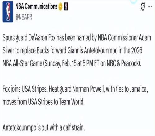 雄鹿官宣字母哥缺戰全明星賽!福克斯頂替入選鮑威爾調至世界隊