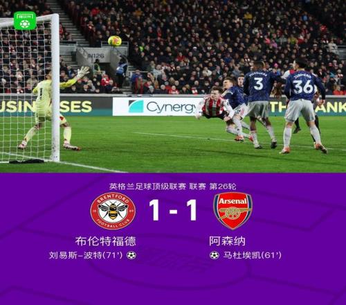 北京時間2月13日英格蘭足球頂級聯賽 聯賽 第26輪,布倫特福德主場對陣阿森納。上半場拉亞神撲救險,加布里埃爾、哲凱賴什染黃,下半場馬杜埃凱頭球破門,波特扳平比分,馬丁內利失單刀。最終比分布倫特福德 1-1 阿森納。