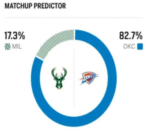 賽前,美媒ESPN對(duì)本場(chǎng)比賽進(jìn)行了勝率預(yù)測(cè),雄鹿隊(duì)勝率僅有17.3% ,雷霆?jiǎng)俾蕜t高達(dá)82.7% ,差距非常明顯。