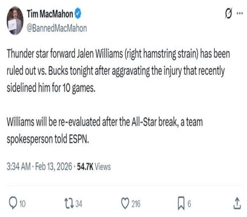 不僅核心亞歷山大持續缺陣,二當家杰倫威廉姆斯又遭遇右腿筋拉傷,此前他因為這一傷病連續缺席10場,突然復出對陣湖人后再度受傷,這樣的狀況不僅有可能影響雷霆隊常規賽階段競爭聯盟第一寶座,更是給季后賽衛冕之旅埋下不小的隱患。