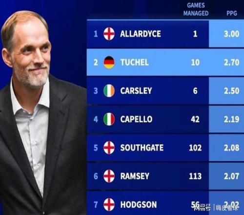 8場預選賽,加上2場非正式比賽,圖赫爾僅在友誼賽負于塞內加爾,也是唯一有失球的比賽。統計表明,10場9勝,場均2.7分,是英格蘭所有主帥中第二高的,僅次于只帶隊一場,就因為丑聞而下課的阿勒代斯。其實,前任卡斯利場均得分也能排在第三名,也不算太差,隨后包括卡佩羅、索斯蓋特等熟悉的名字。