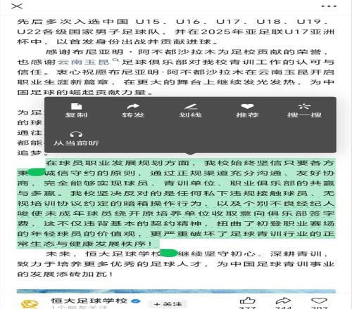 而在恒大足校的官宣中,著重提到了“在球員職業(yè)發(fā)展規(guī)劃方面,我校始終堅(jiān)信只要各方秉持誠(chéng)信守約的原則,通過(guò)正規(guī)渠道充分溝通、友好協(xié)商,完全能夠?qū)崿F(xiàn)球員、青訓(xùn)單位、職業(yè)俱樂(lè)部的共贏與多贏。我校堅(jiān)決反對(duì)的是任何私下違規(guī)接觸球員、無(wú)視培訓(xùn)協(xié)議約定的暗箱操作行為,以及個(gè)別不良經(jīng)紀(jì)人唆使未成年球員繞開(kāi)原培養(yǎng)單位收取意向俱樂(lè)部簽字費(fèi),這不僅違背基本的契約精神,扭曲了初登職業(yè)賽場(chǎng)的年輕球員的價(jià)值觀,更嚴(yán)重破壞了足球青訓(xùn)行業(yè)的正常生態(tài)與健康發(fā)展秩序”!